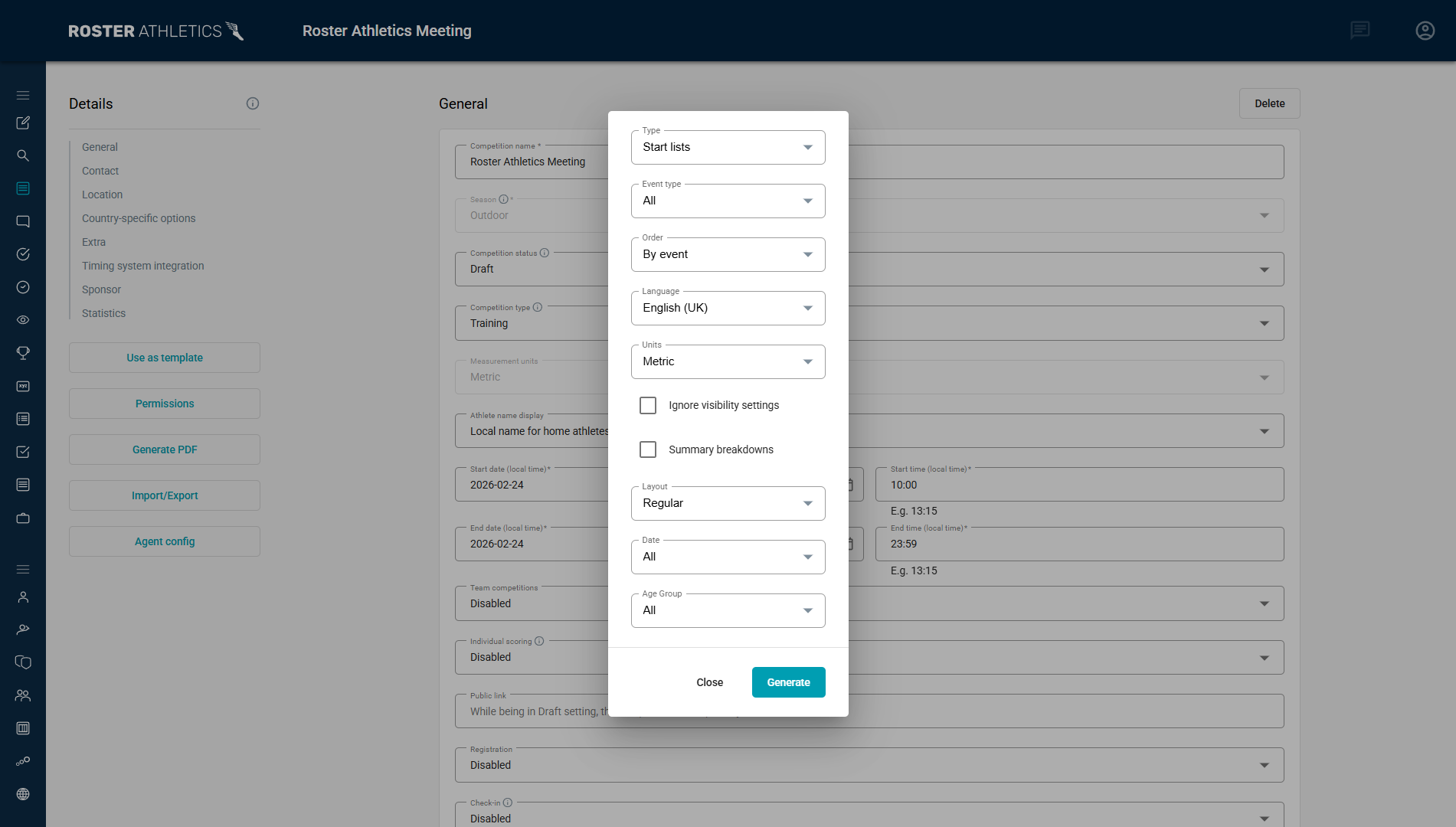 You can create PDF files and printouts for the schedule, start lists, results, score sheets, lap sheets and team results either under the Details of the competition by clicking on the Generate PDF button or in the schedule, start lists and results views.