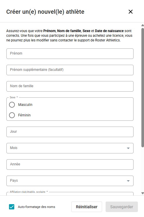 2. Dans les deux situations vous verrez une fenêtre Créer un(e) nouvel(le) athlète.