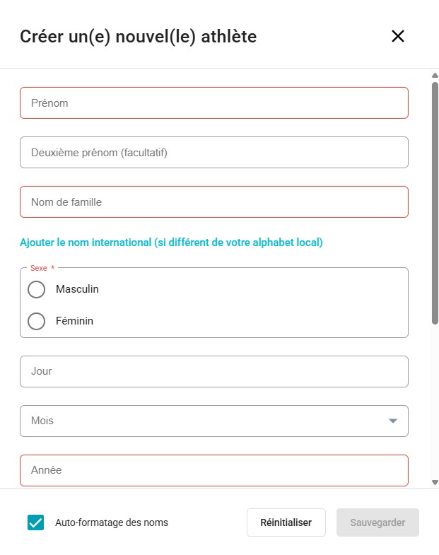 Pour ajouter un nouvel athlète, vous devez saisir le prénom, le nom de famille et sélectionner le sexe et le pays applicables (tous ces champs sont obligatoires). Vous pouvez également ajouter un deuxième prénom, une date de naissance complète (jour, mois, année) ou uniquement l’année si vous ne connaissez que l’année de naissance.