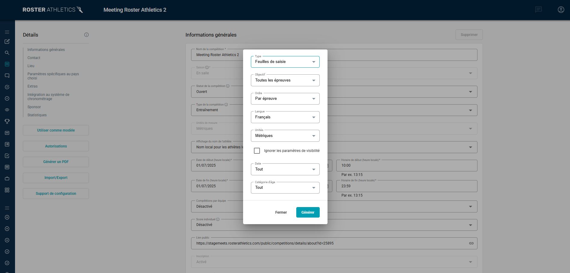 À partir des Détails de la compétition, en cliquant sur le champ Générer un PDF ;