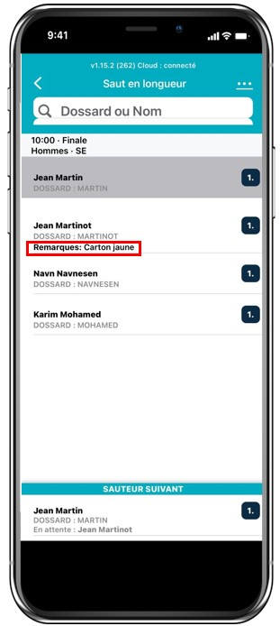 - Remarques publiques et internes pour un athlète : L'organisateur peut ajouter une remarque publique et/ou interne pour un athlète ou une équipe de relais sur la plateforme de gestion en ligne (pour un niveau d'épreuve spécifique de la compétition, les séries ou la finale par exemple). Ces remarques seront affichées sous le nom du participant. Il vous faudra cliquer dessus pour voir le texte complet au cas où le texte de la remarque serait trop long .
