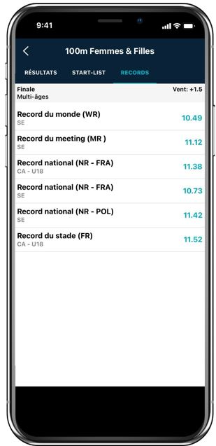 - Résultats : Au cas où un athlète établit plusieurs records (record du meeting et record personnel par exemple), il faudra alors cliquer sur le nom du record sous le résultat pour ouvrir une nouvelle fenêtre et voir tous les records qui ont été établis par cet athlète.