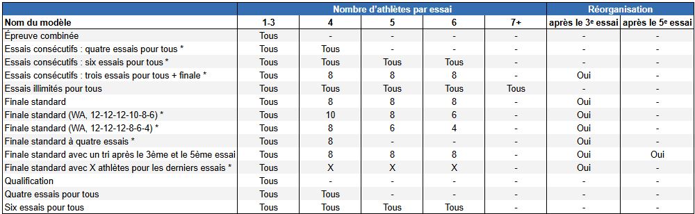 Qualification : maximum 3 essais ; l’athlète s’arrête après avoir atteint la marque de qualification (si Q est définie).