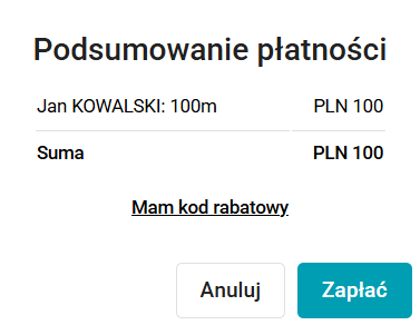 Jeśli masz ważny kupon rabatowy wygenerowany dla danych zawodów, kliknij Mam kod rabatowy, wprowadź kod, a następnie kliknij Zastosuj, aby go wykorzystać.